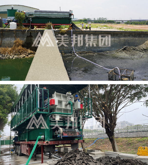 Project Overview: This project is to treat a fish pond sludge in Zhuhai for solid-liquid separation, then add biological bacteria to change the soil properties and enter the Meibang vehicle mounted high-pressure diaphragm filter press. After the filter press separates the clean water for recycling, the mud cake is transported by screw to the granulator to produce insoluble and non compacted sponge soil.